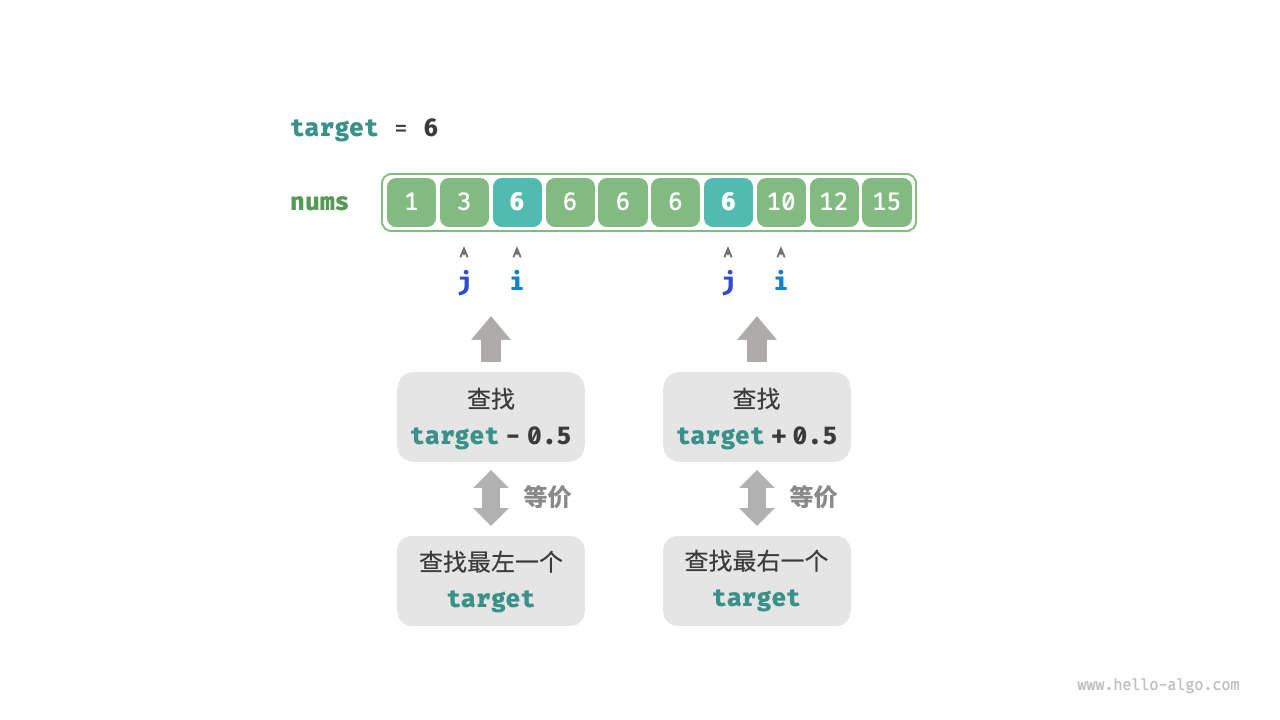target:可以转化为查找target - 0.5,并返回指针 \(i\) 。 - 查找最右一个